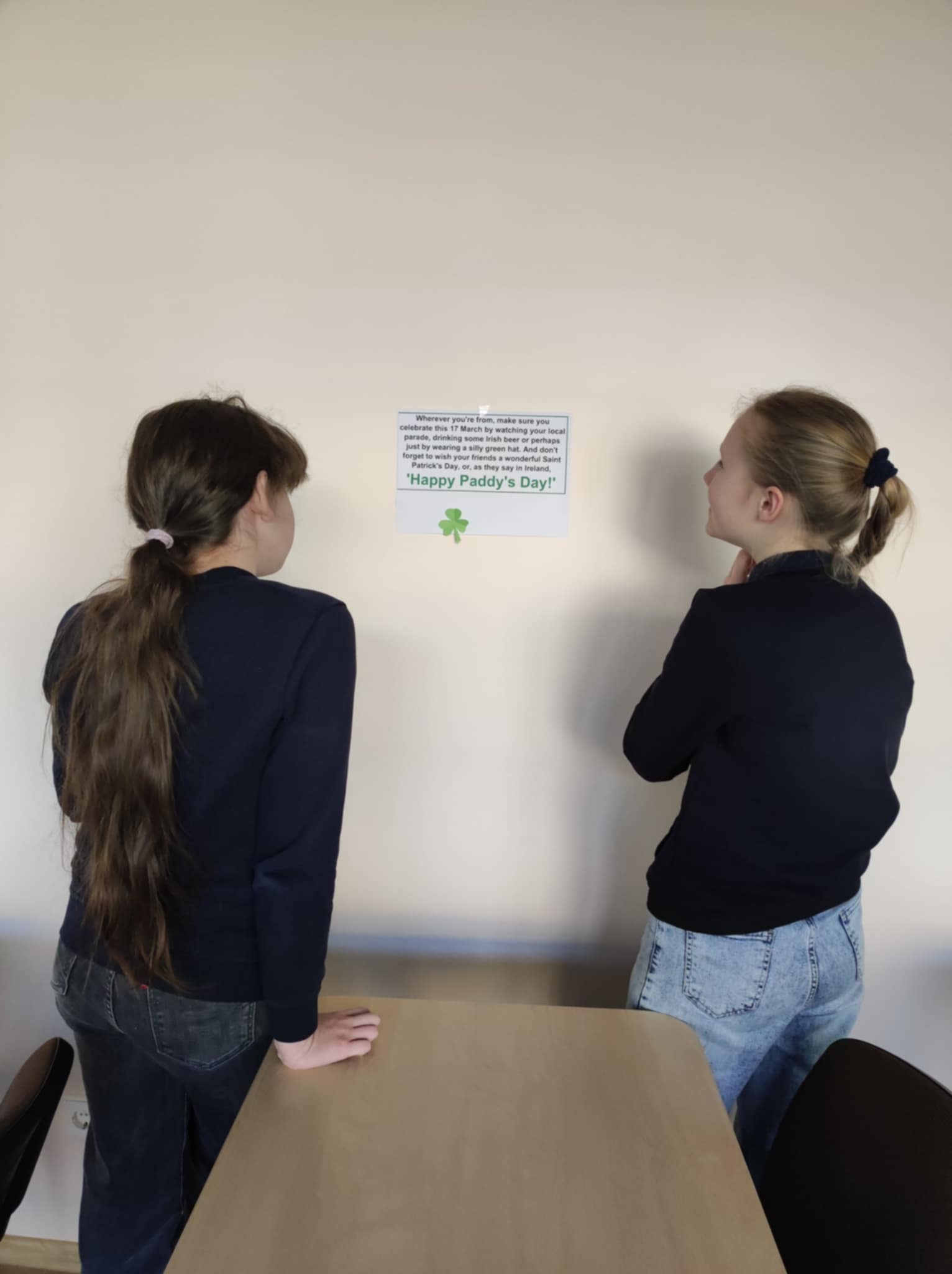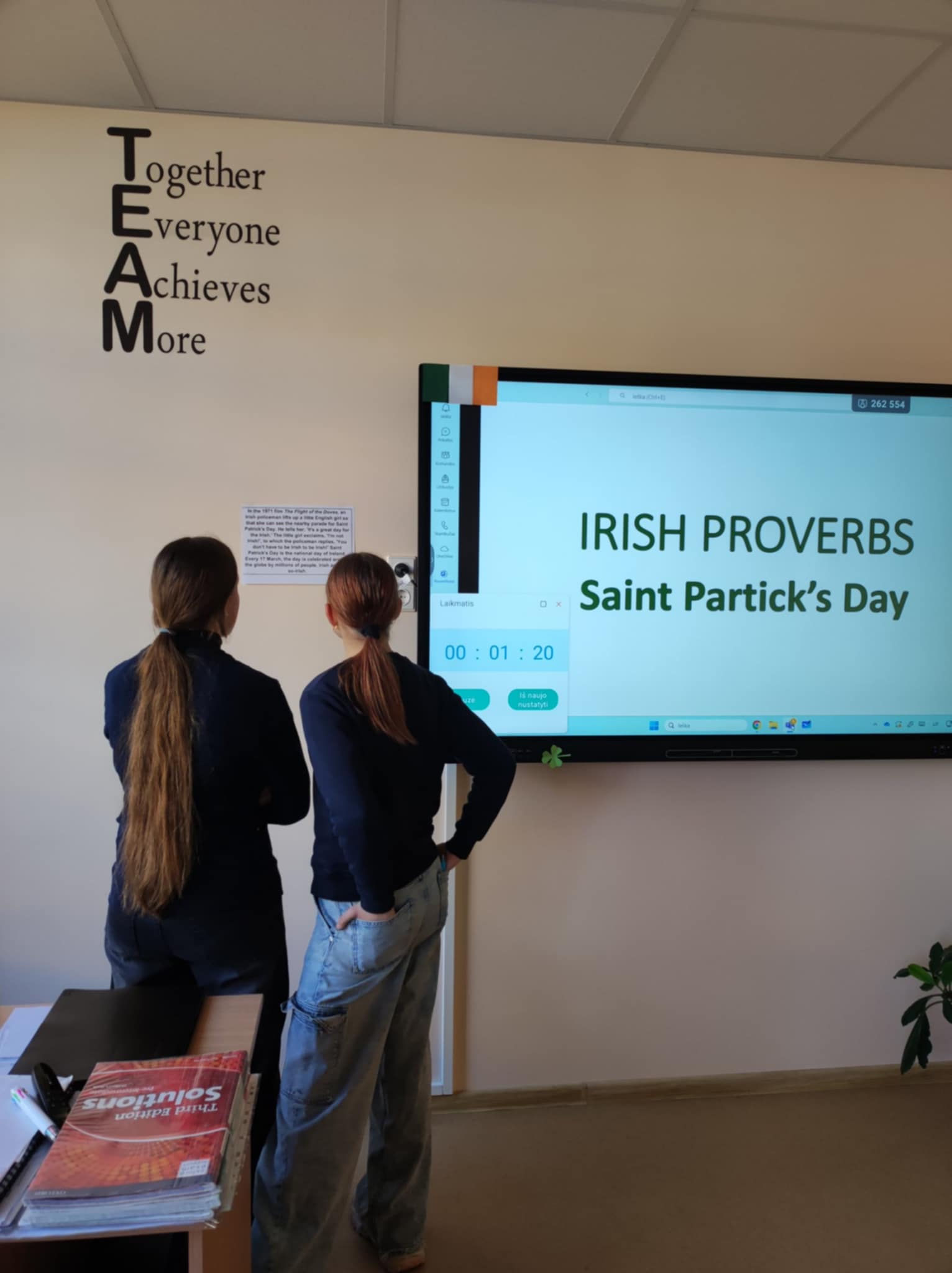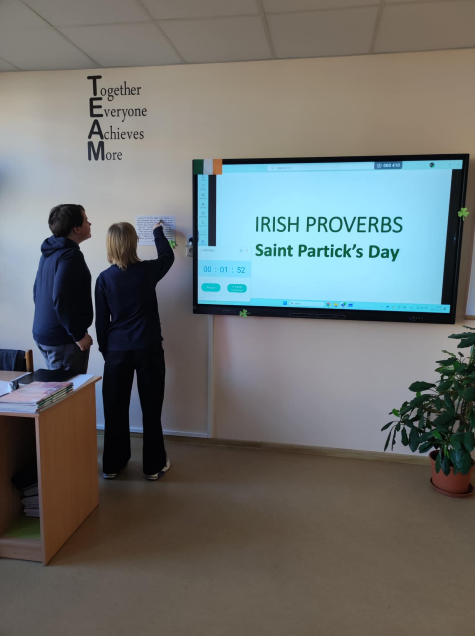 Kovo 17 dieną pasaulis mini šv. Patriko dieną. Vieni žygiuoja parade, kiti dažo upes žaliai, o Jurbarko Naujamiesčio progimnazijos mokiniai, padėdami vieni kitiems suprasti informaciją, atsakinėjo į viktorinos klausimus ir aiškinosi airiškų patarlių reikšmes.
