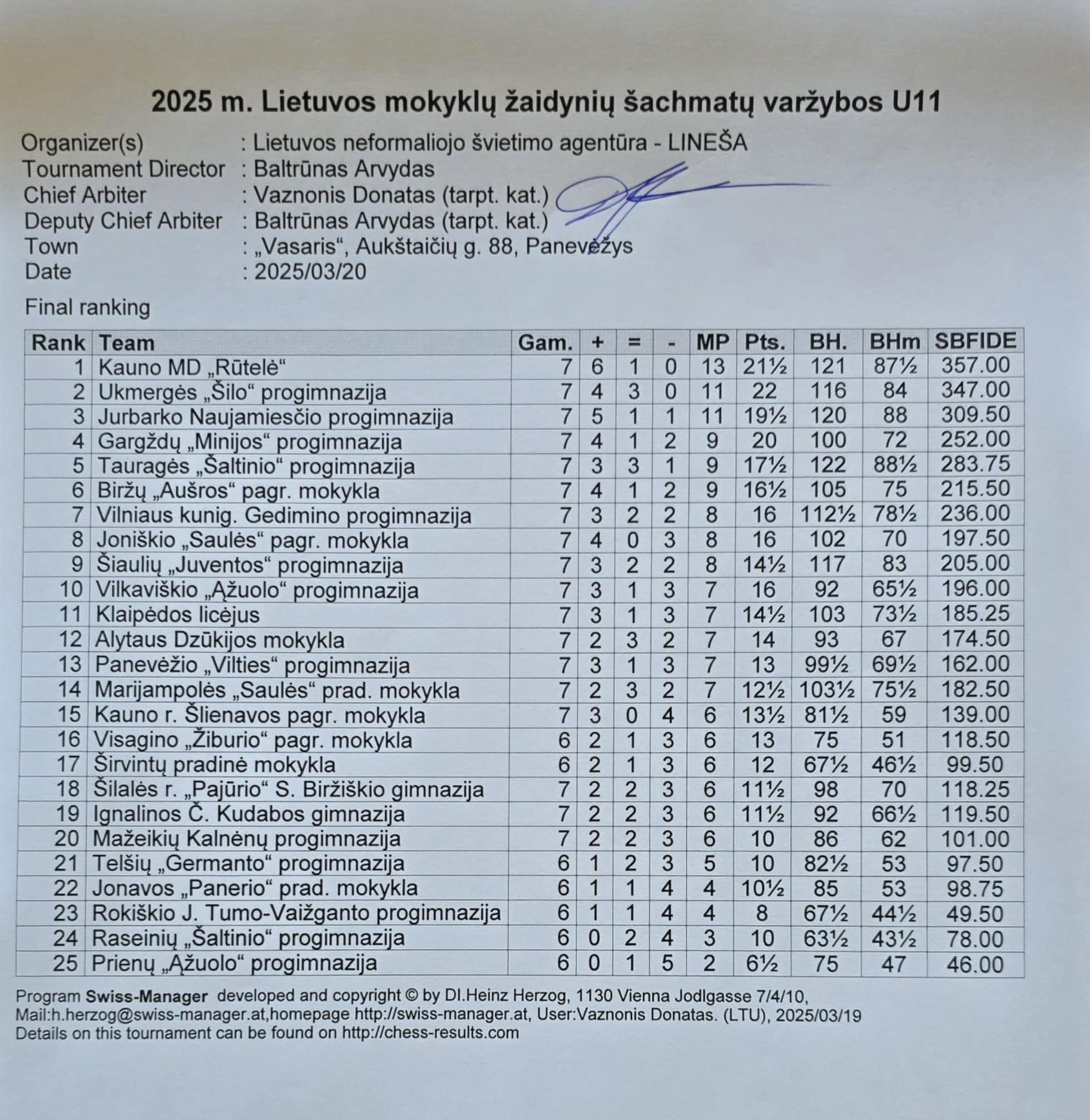 Varžybose dalyvavo 25 mokyklų komandos. Varžybos vyko 7 ratų šveicariška sistema (10 min. plius 5 s.).