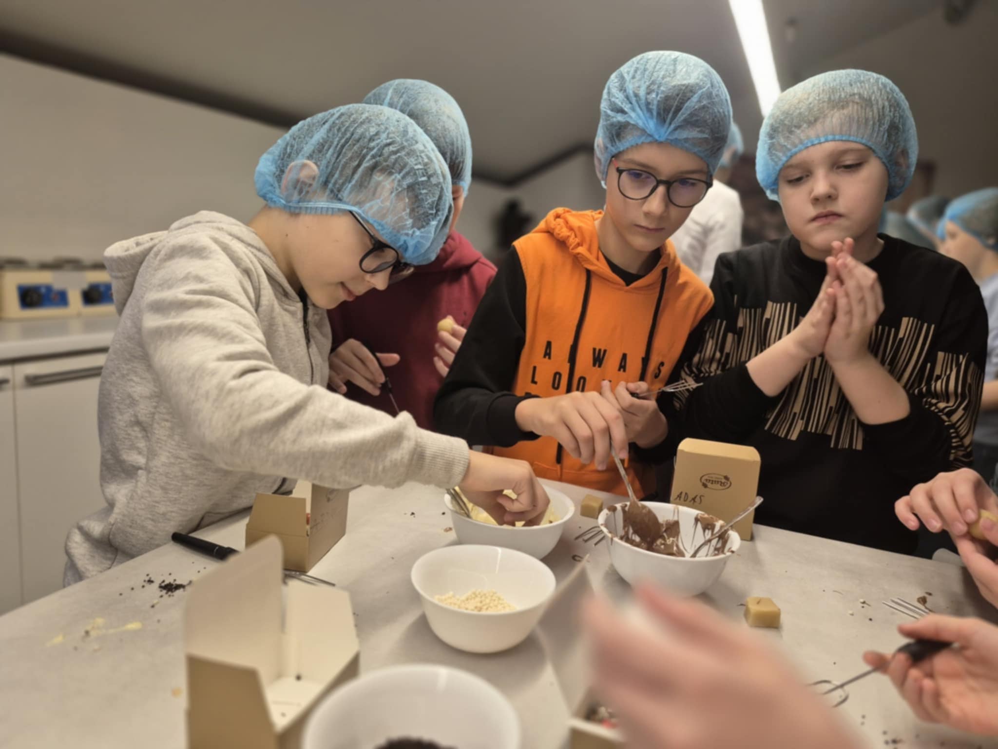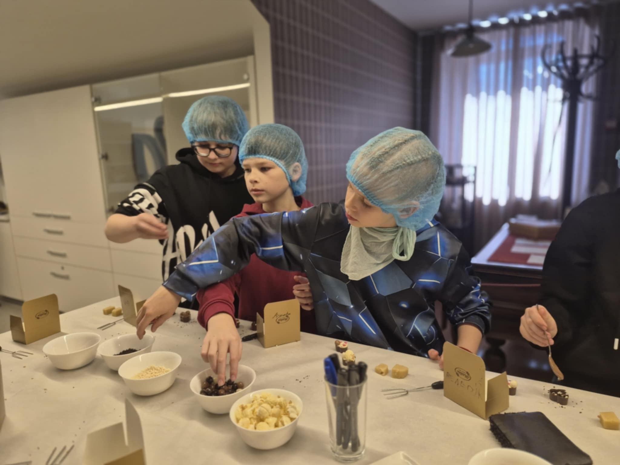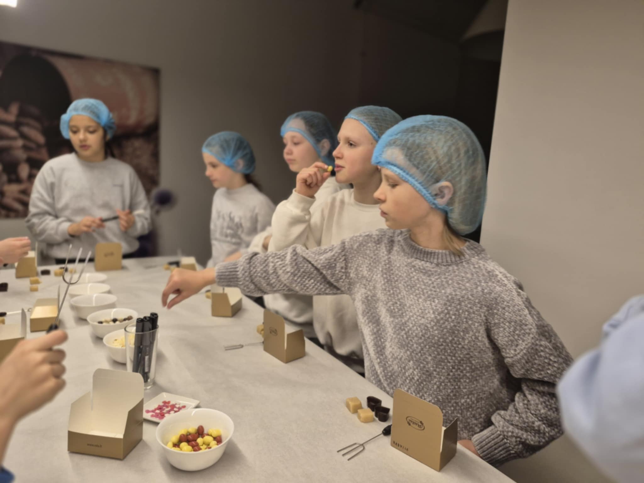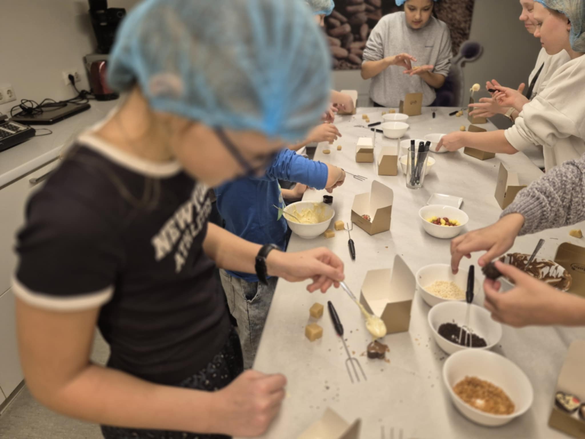 Kūrybinėse dirbtuvėse mokiniai mokėsi gaminti šokoladinius saldainius. Patys kūrė saldumynus, ragavo skirtingų rūšių šokoladą ir tapo tikrais šokolado meistrais! Savo pagamintais šokoladiniais šedevrais vaikai galėjo pasidžiaugti patys ir pradžiuginti artimuosius.