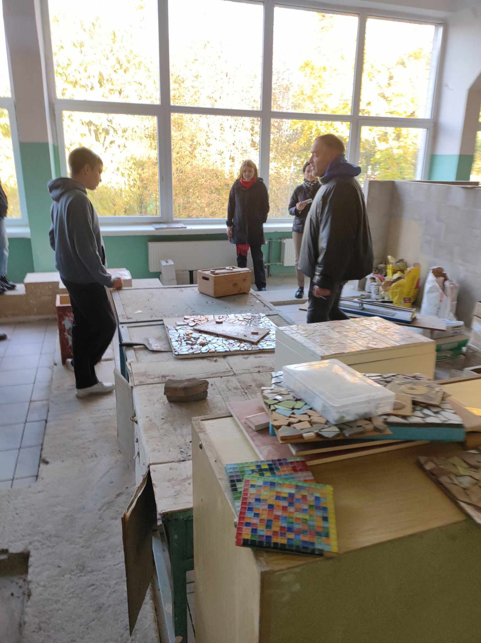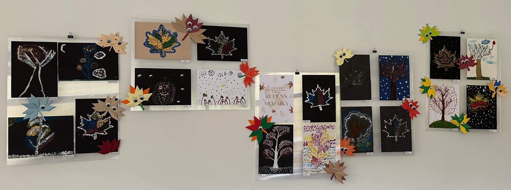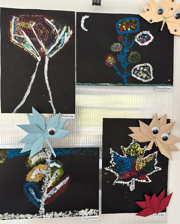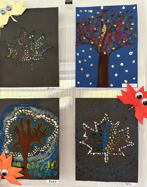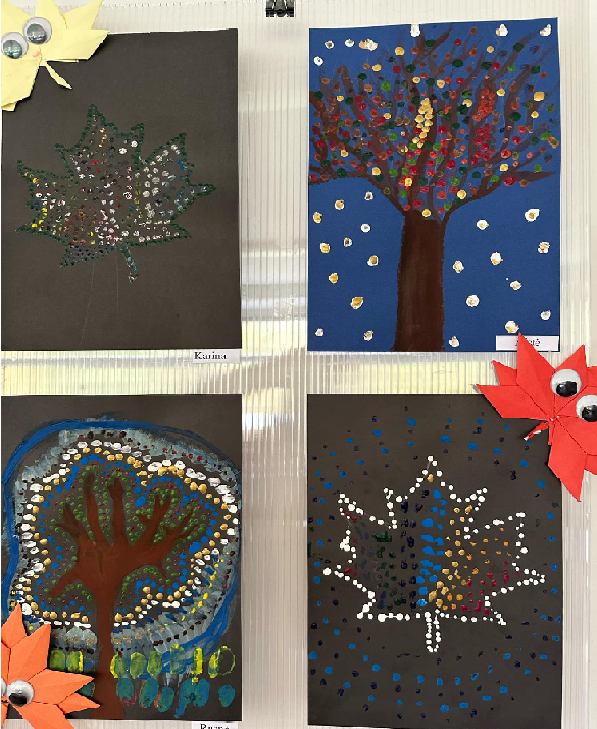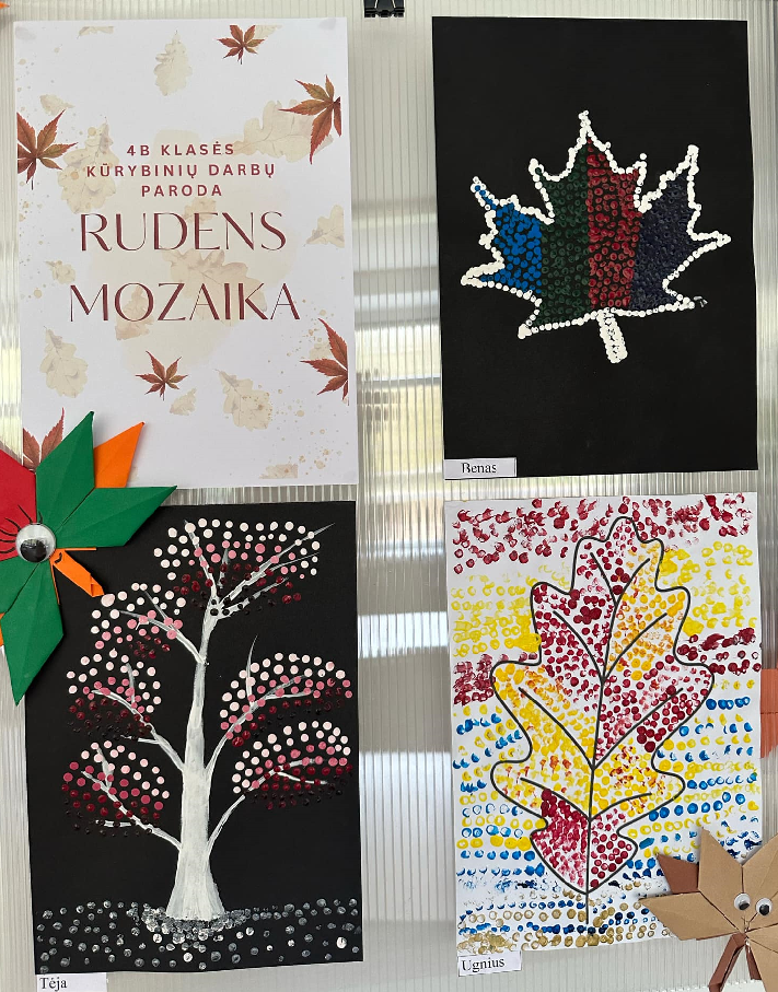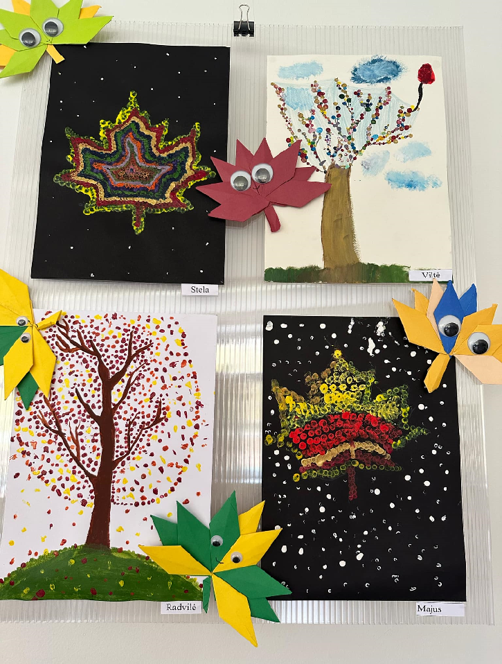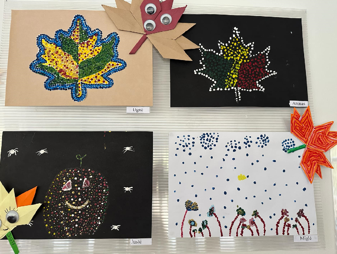 Mokiniai sukūrė gamtos vaizdus: spalvingus medžius ir krentančių lapus, rudens gėrybes. Spalvoti taškeliai ant popieriaus susijungė į ryškias mozaikas, atspindinčias rudens spalvų grožį ir metų laikų pokyčius.